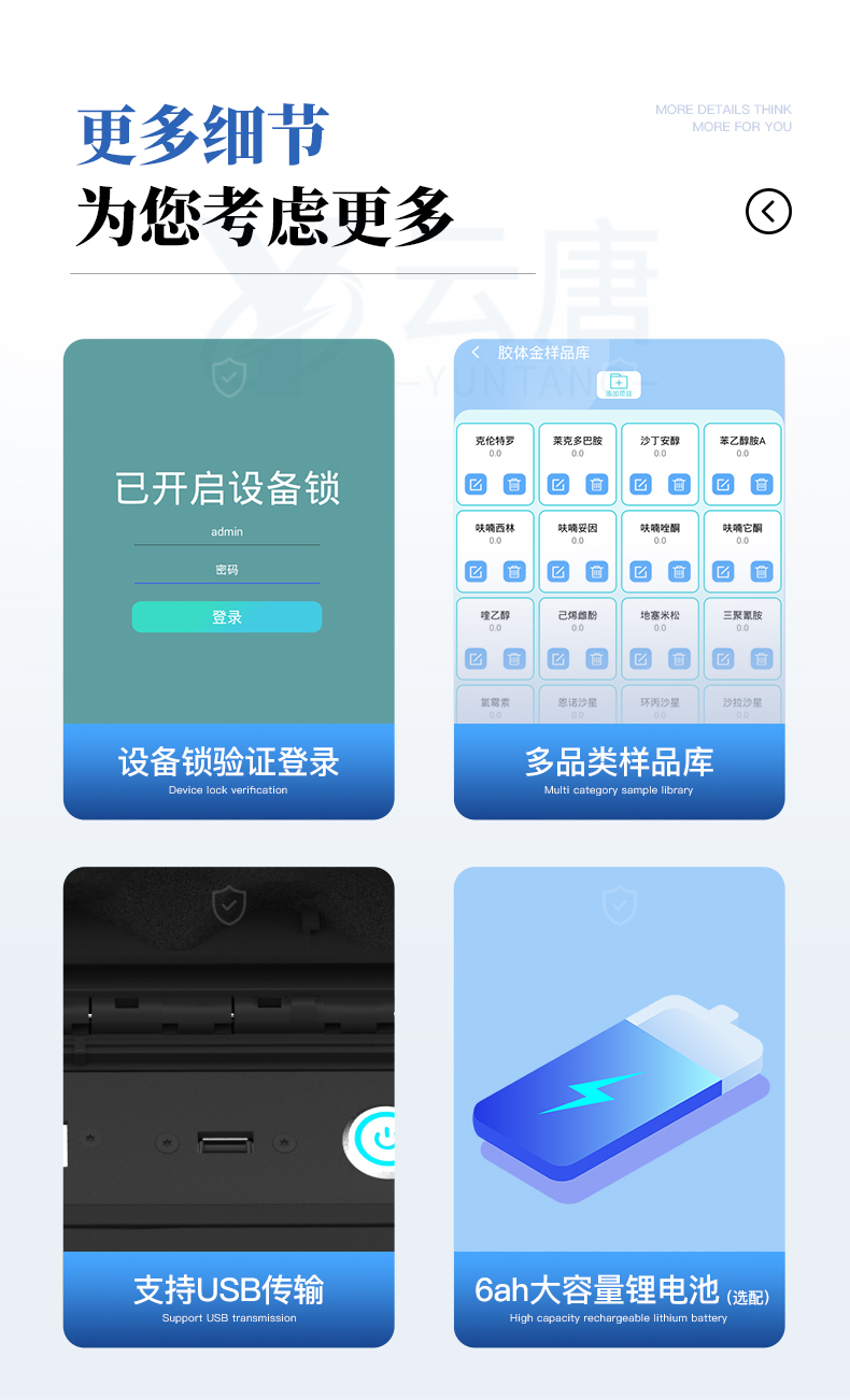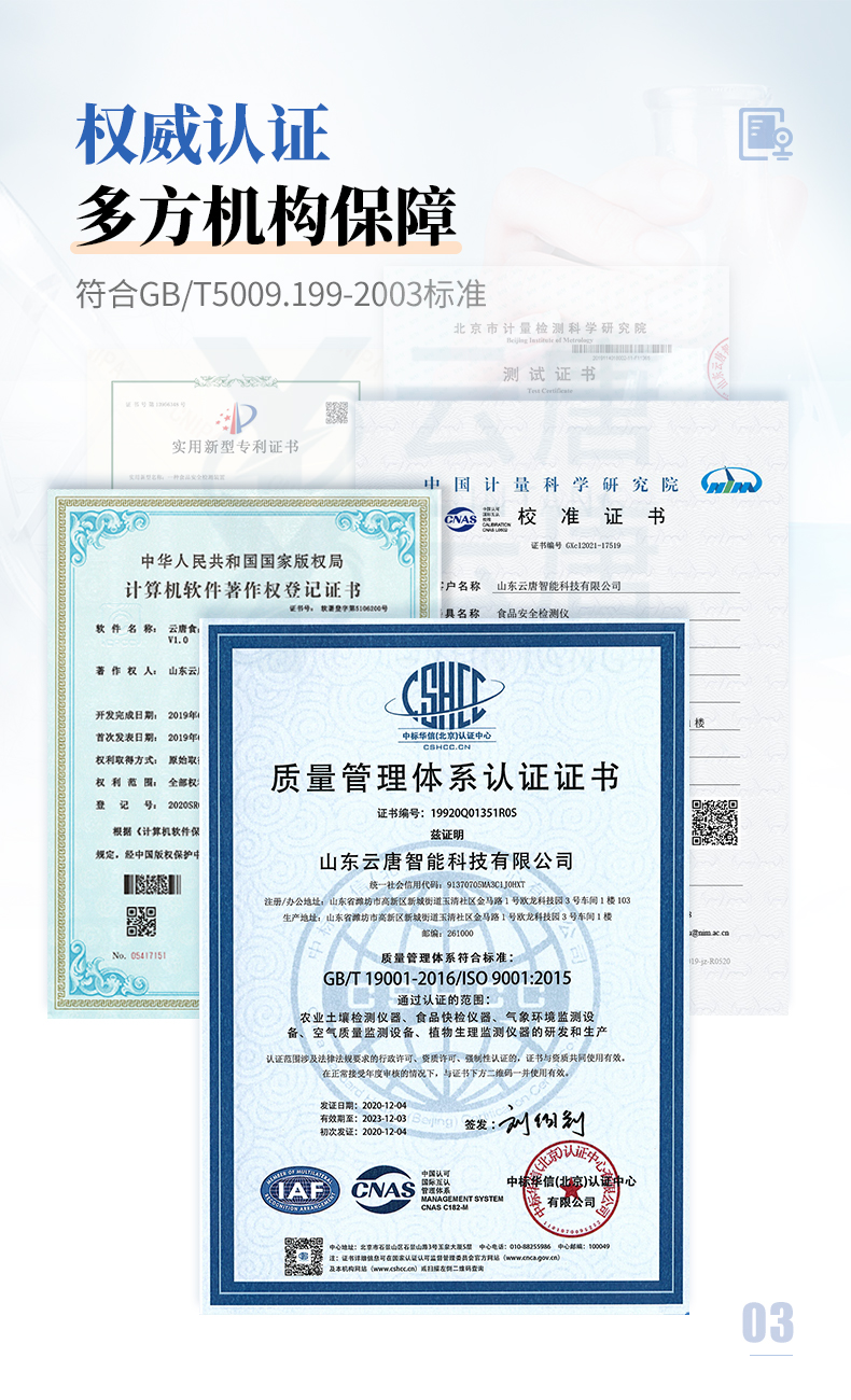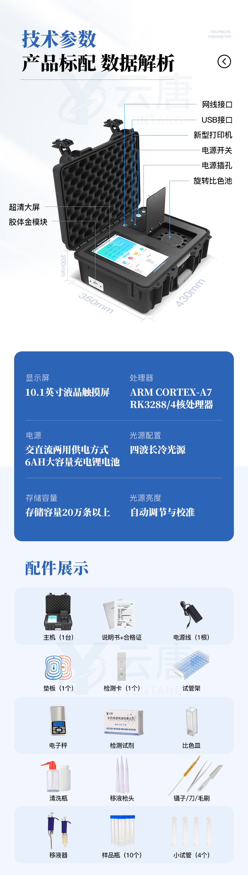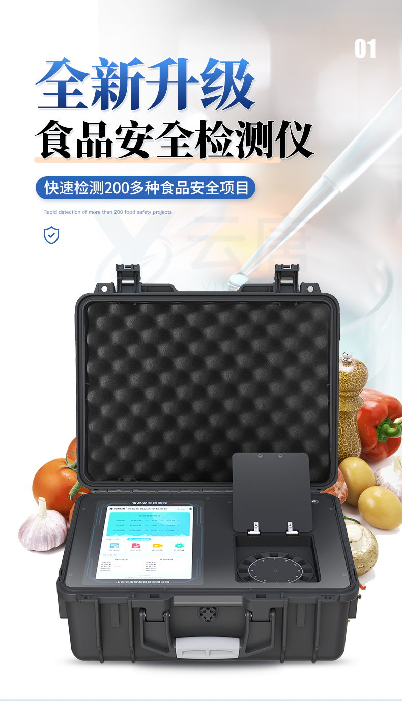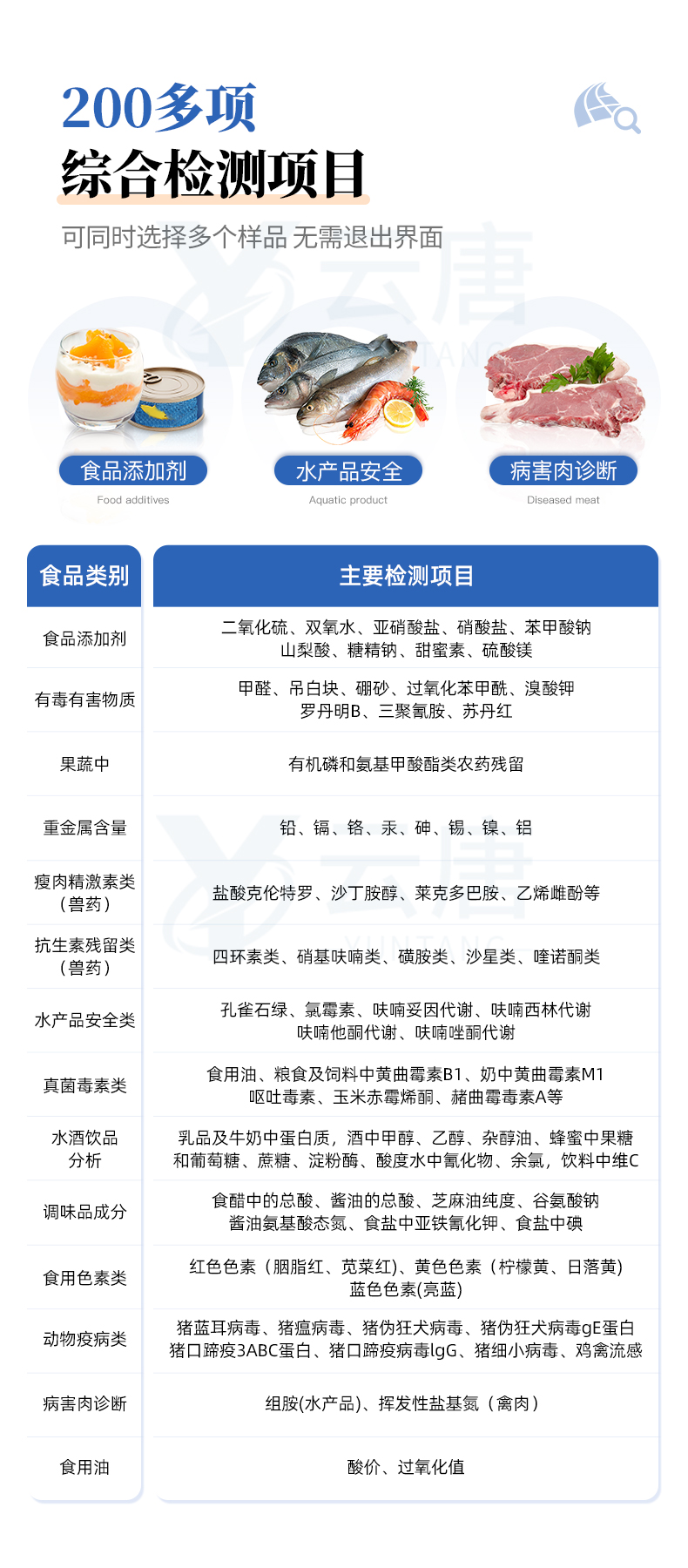 山東云唐智能科技有限公司生產(chǎn)的高智能食品安全檢測儀可快速檢測200多種食品安全項目,包含非食用化學物質(zhì)、濫用食品添加劑、農(nóng)藥殘留、獸藥殘留、重金屬、病害肉、營養(yǎng)強化劑、抗生素類殘留、激素類殘留、真菌毒素類殘留、化學類殘留等項目的定性定量檢測。